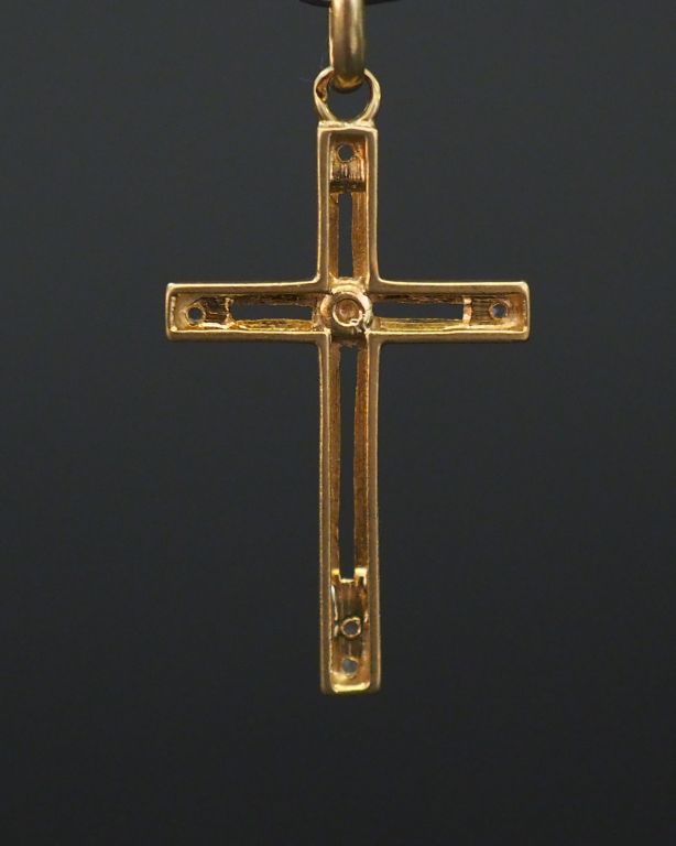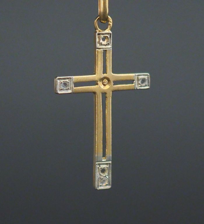 Pendentif ajouré en forme de croix en or jaune. Les extrémités serties de petits éclats de diamants. 2,8 x 1,5 cm Poids tel. 1,15 g (manque un petit éclat)