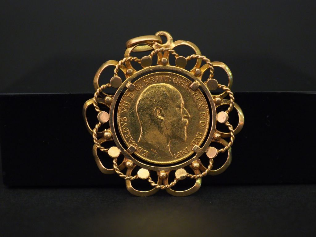 Pendentif ajouré en or jaune, serti en son centre d’un Souverain or, Edouard VII, 1902. Poids. 7,85 g