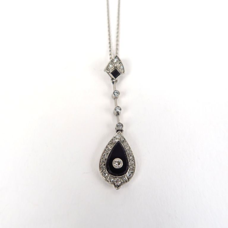 Pendentif Art déco et sa chaine en onyx, diamants et brillants. Monture or blanc. Poids tel. 5,40 gr