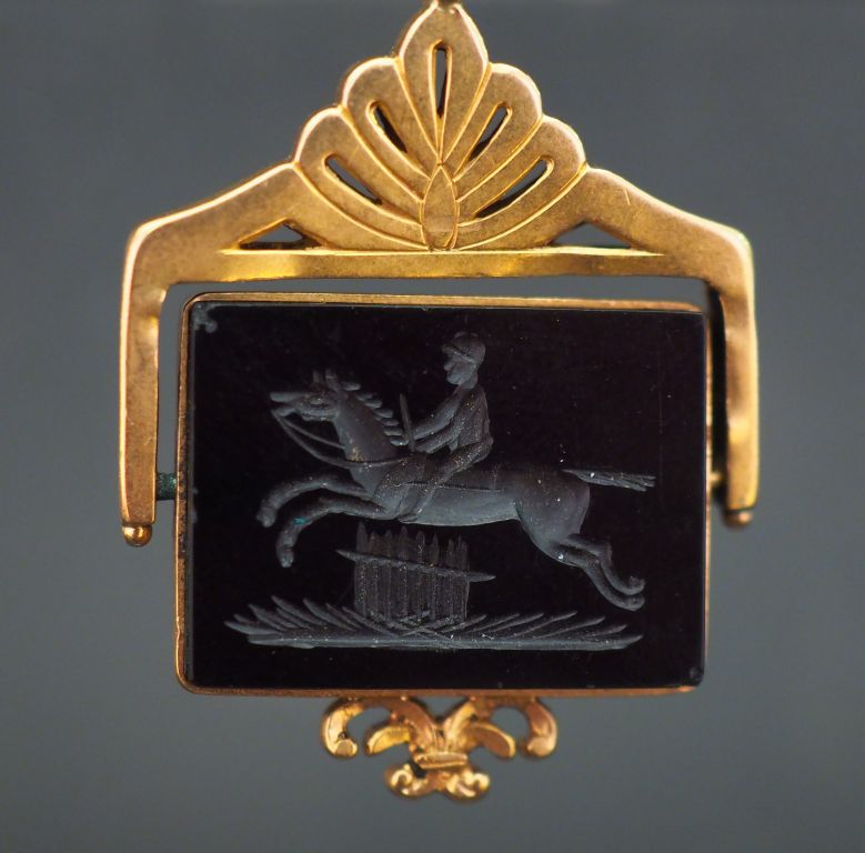 Pendentif articulé en or jaune, sertie d’une intaille figurant un cavalier. Poids tel. 6 g
