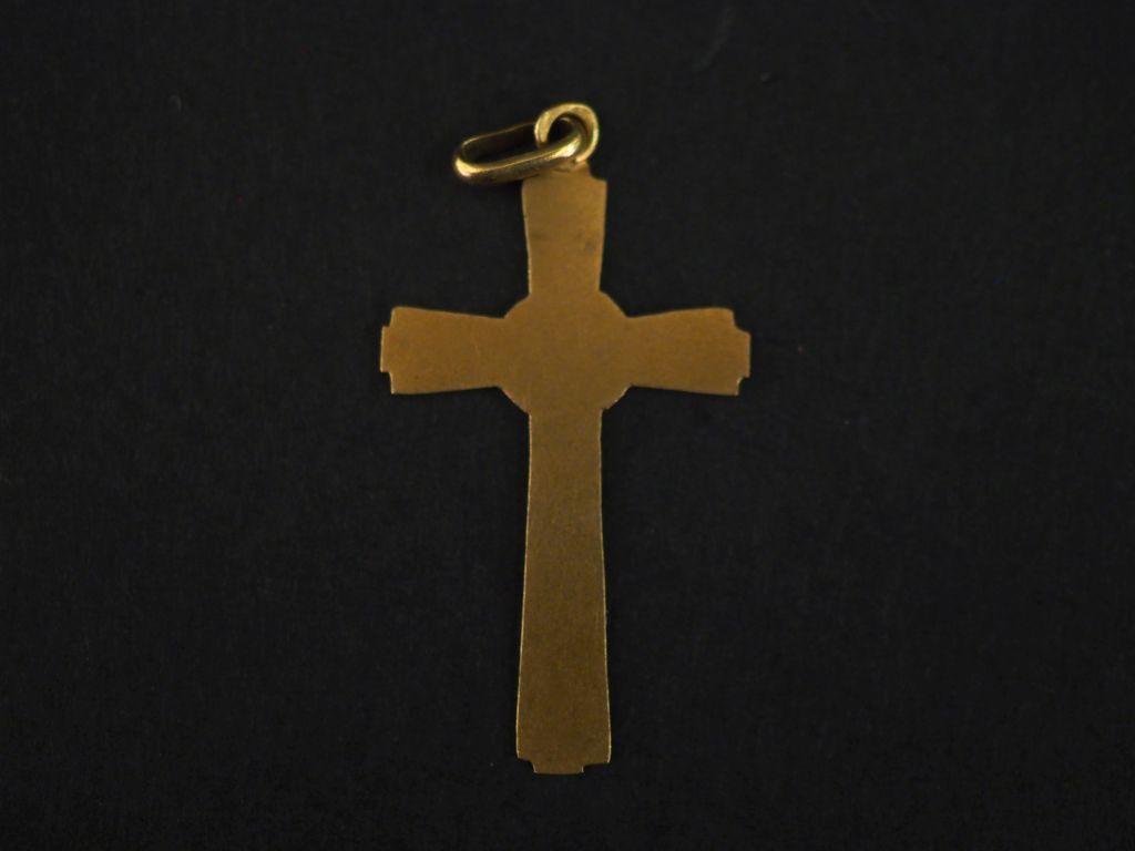 Pendentif de style Art déco en forme de croix en or jaune 750, agrémenté de motifs géometriques. 2,8 x 1,7 cm Poids. 0,98 g