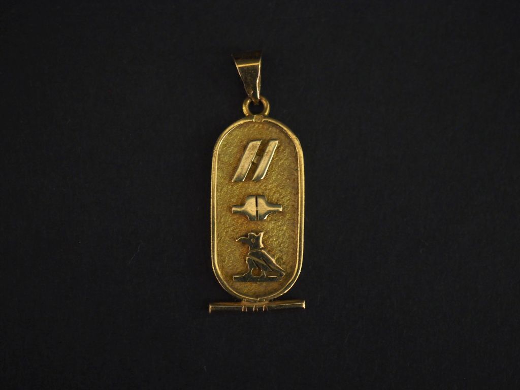 Pendentif de style égyptien en or jaune 585, à décor de hiéroglyphes. 2,7 x 1,3 cm Poids. 4,09 g