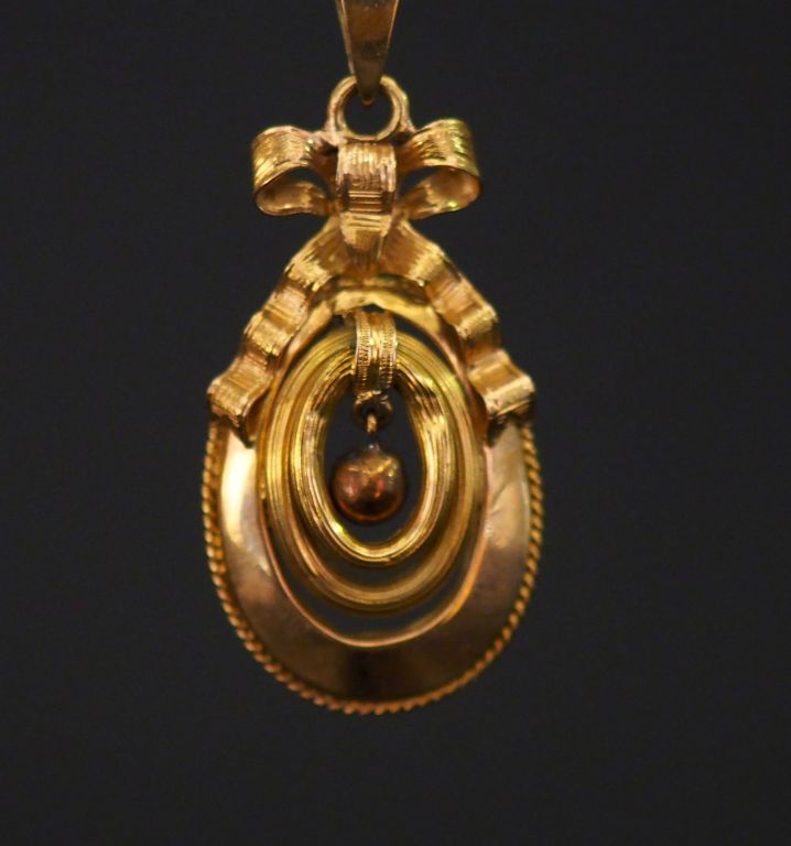 Pendentif de style Louis XVI en or jaune, à décor d'une boule en pendeloque et d'un nœud de ruban surmontant le motif central. H. 3 cm Poids. 2,13 g (petites traces de soudures anciennes)