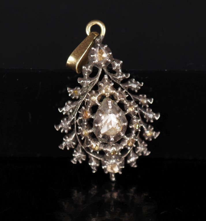 Pendentif en argent en forme de goutte, sertie de petits diamants taillés en rose. H. 2,8 cm Poids tel. 5,28 g (petits manques)