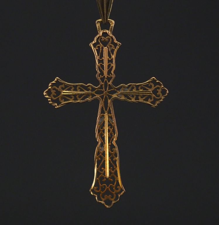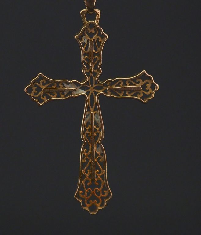 Pendentif en forme de croix en or jaune, à décor ajouré de rinceaux. 3,6 x 2,5 cm Poids. 2,55 g