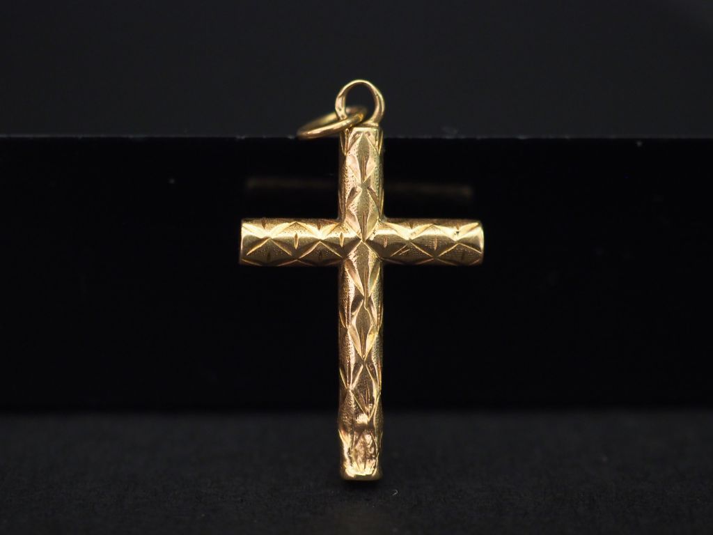 Pendentif en forme de croix en or jaune, à décor de motifs géométriques. 2,3 x 1,1 cm Poids. 0,87 g (petit enfoncement)