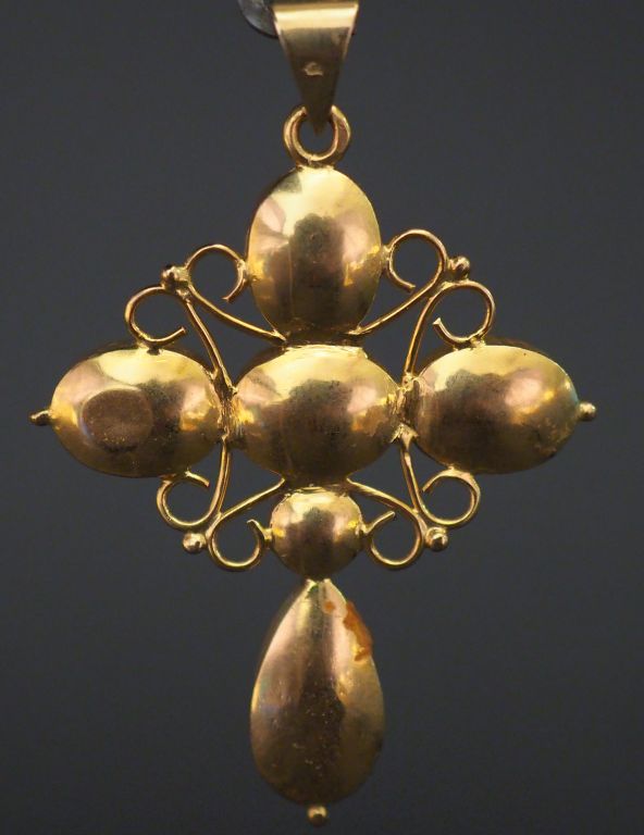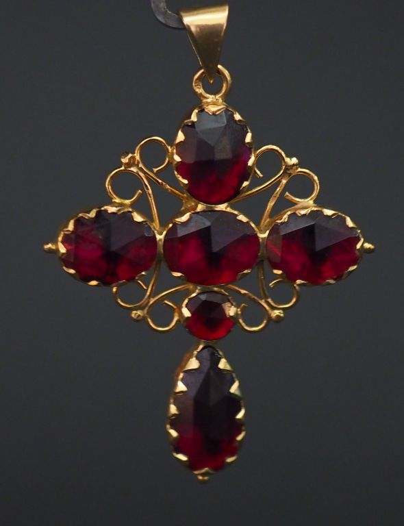 Pendentif en forme de croix en or jaune, serti de six grenats, décor ajouré. 4,5 x 3,6 cm Poids tel. 6,26 g
