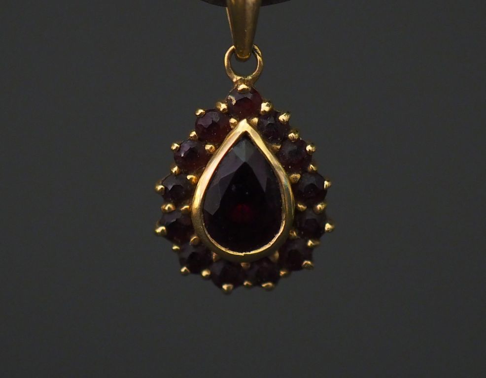Pendentif en forme de goutte en or jaune, serti en son centre d’un grenat taillé en poire entouré d’une ligne de treize petits grenats. H. 1,3 cm Poids tel. 1,50 g