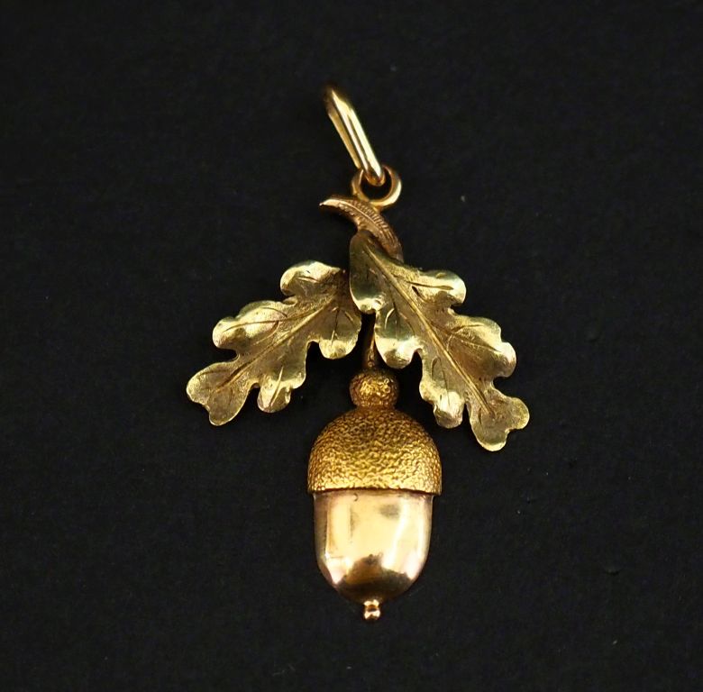Pendentif en or 750, à décor de gland et feuilles de chêne. 3 x 2,2 cm Poids. 2,31 g