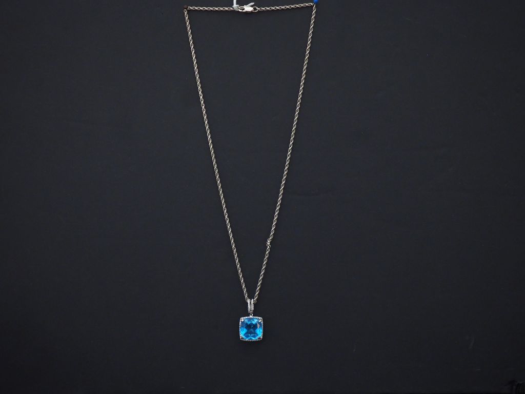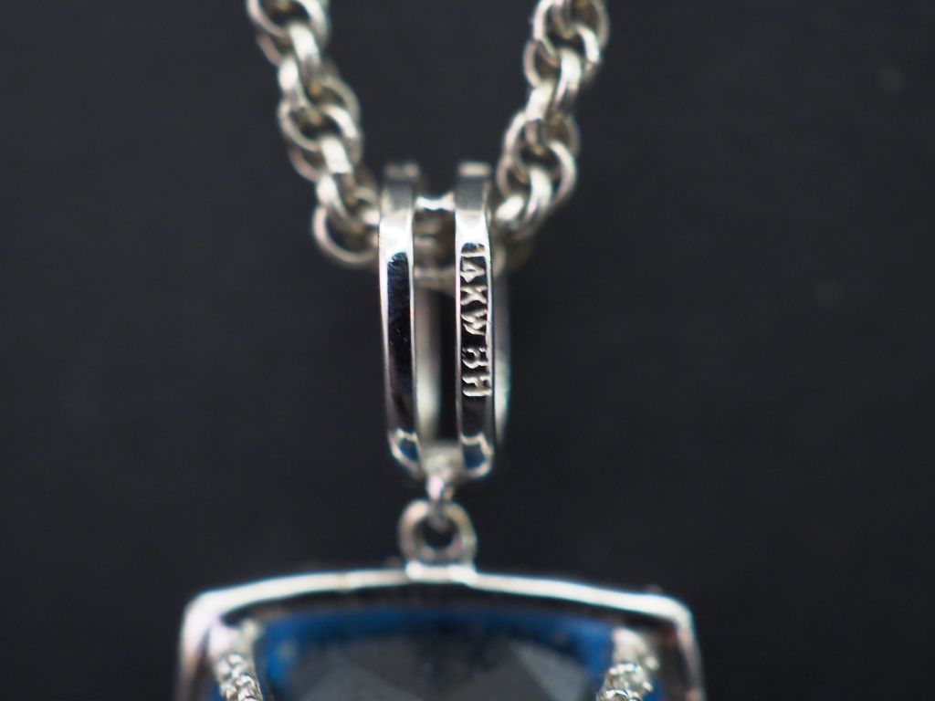 Pendentif en or blanc 14k, serti en son centre d’une pierre bleu turquoise et de petits éclats de diamant. 1,5 x 1,5 cm Poids tel. 5,50 g On y joint une chaine en métal, maille torsadée.