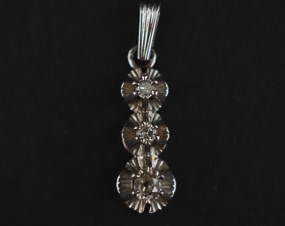 Pendentif en or blanc 750, serti de trois diamants taille ancienne disposés en chute. Le plus gros pesant 0,10 ct environ. H. sans la bélière : 2,1 cm Poids tel. 3,26 g