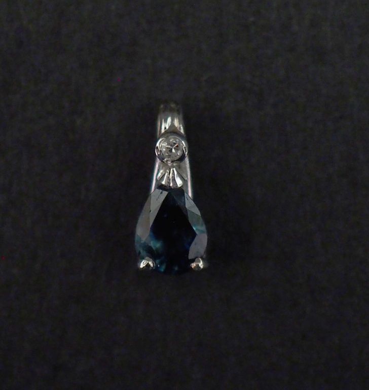 Pendentif en or blanc 750, serti d'un saphir en forme de goutte surmonté d'un petit diamant serti clos. H. 1 cm Poids tel. 0,59 g