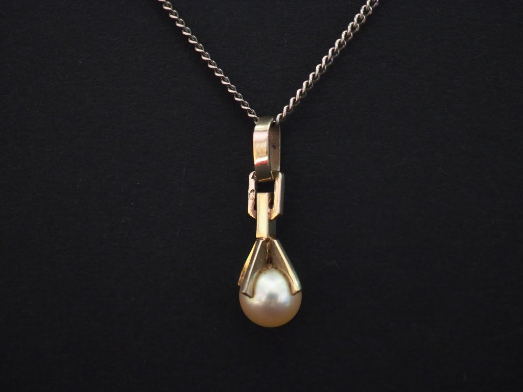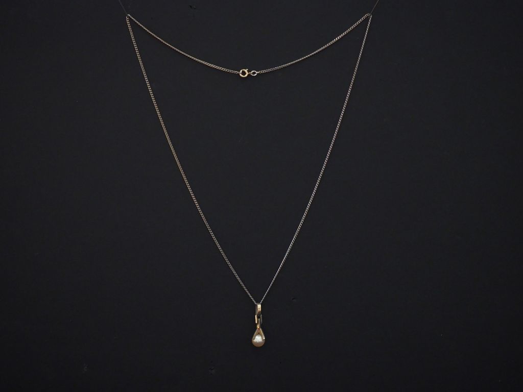 Pendentif en or blanc, serti d’un perle blanche et sa chaine en or gris. Long. 50 cm Poids tel. 5,55 g