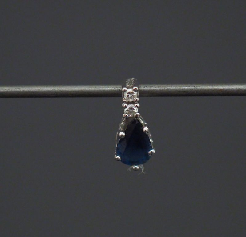 Pendentif en or blanc, serti d'un saphir en forme de goutte, surmonté de deux petits diamants. H. 1 cm Poids tel. 0,70 g