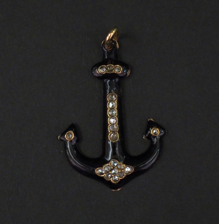 Pendentif en or jaune 14K, émail noir et petits diamants taillés en rose en forme d’ancre. Dim. 4 x 2,8 cm Poids tel. 4,15 g (petits sauts d’émail)