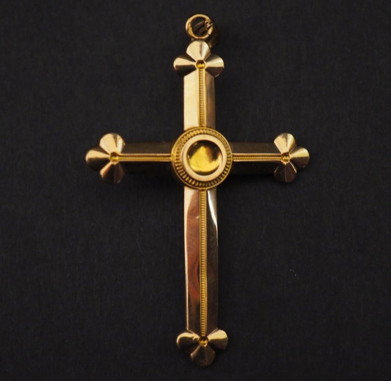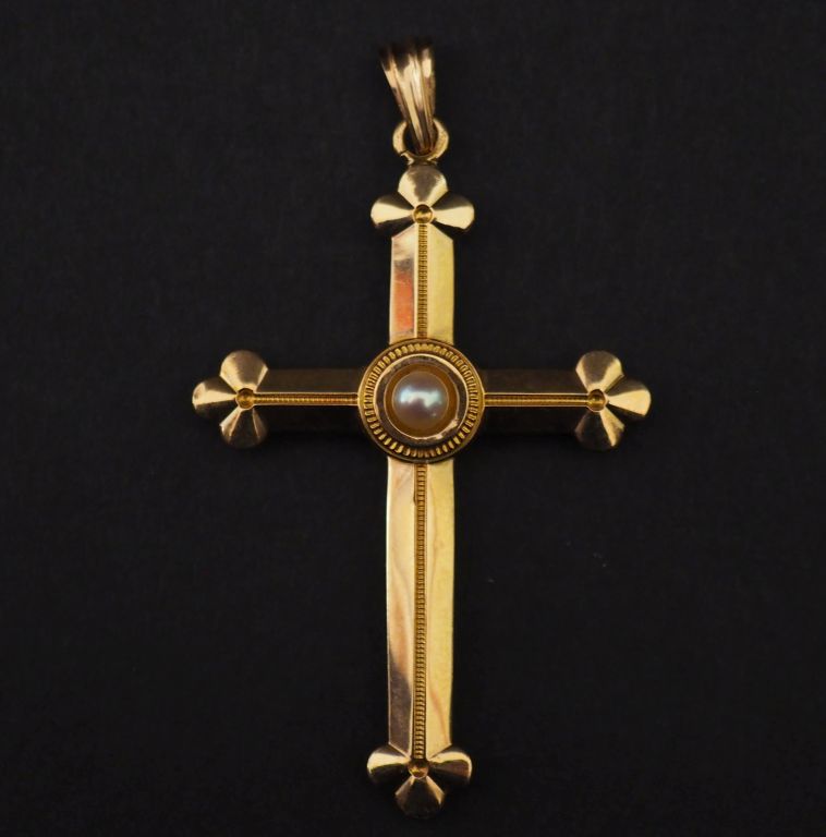 Pendentif en or jaune 750, en forme de croix, serti en son centre d'une perle blanche. Les extrêmités trilobées. 5,5 x 3,8 cm Poids tel. 2,87 g