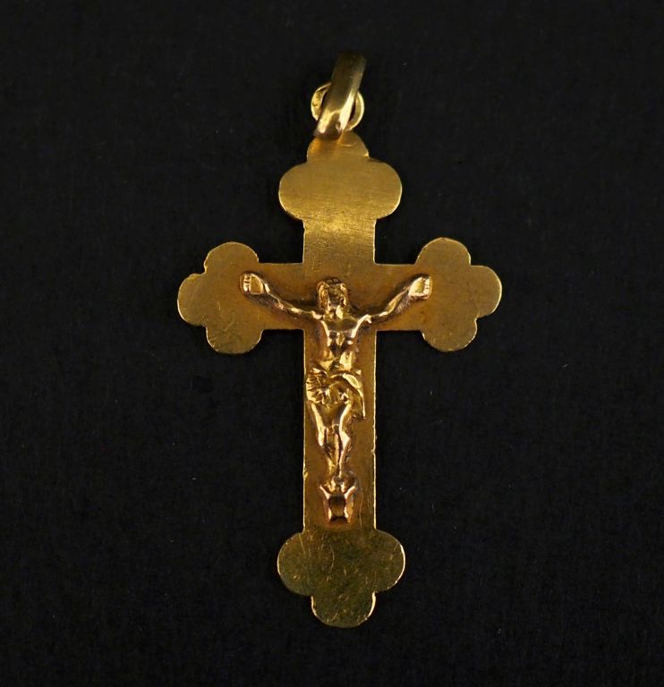 Pendentif en or jaune 750 figurant le Christ en croix. Les extrêmités de forme trilobée. 2,7 x 1,8 cm Poids. 1,26 g