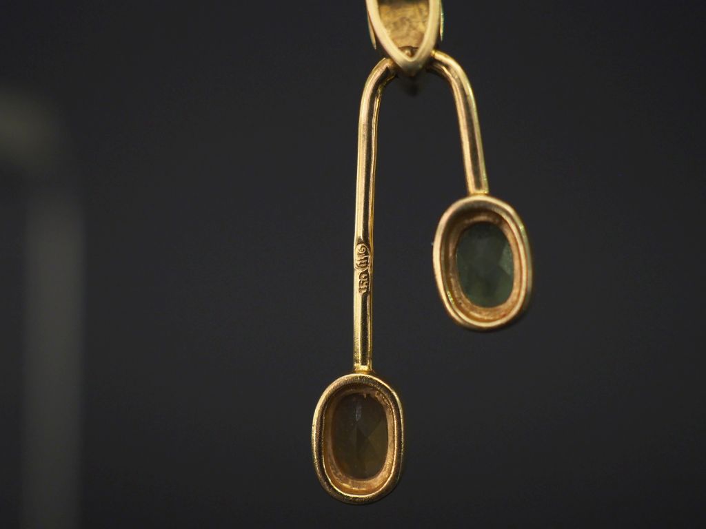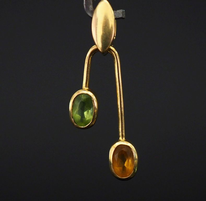 Pendentif en or jaune de forme asymétrique, serti de deux pierres de couleur. H. 3 cm Poids tel. 2,48 g