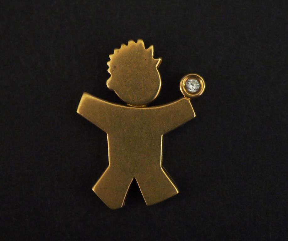 Pendentif en or jaune, en forme de bonhomme tenant dans sa main un petit diamant serti clos. 2,5 x 2 cm Poids tel. 4,19 g