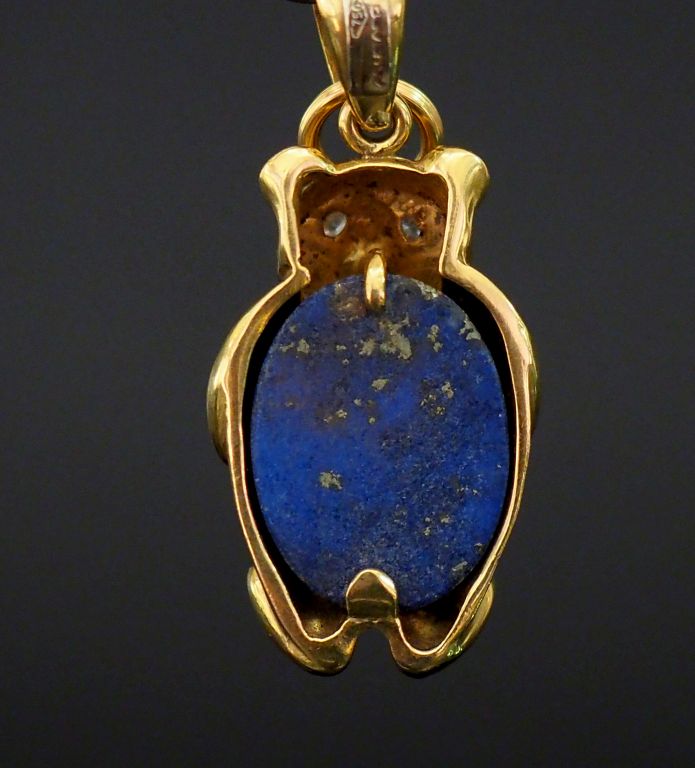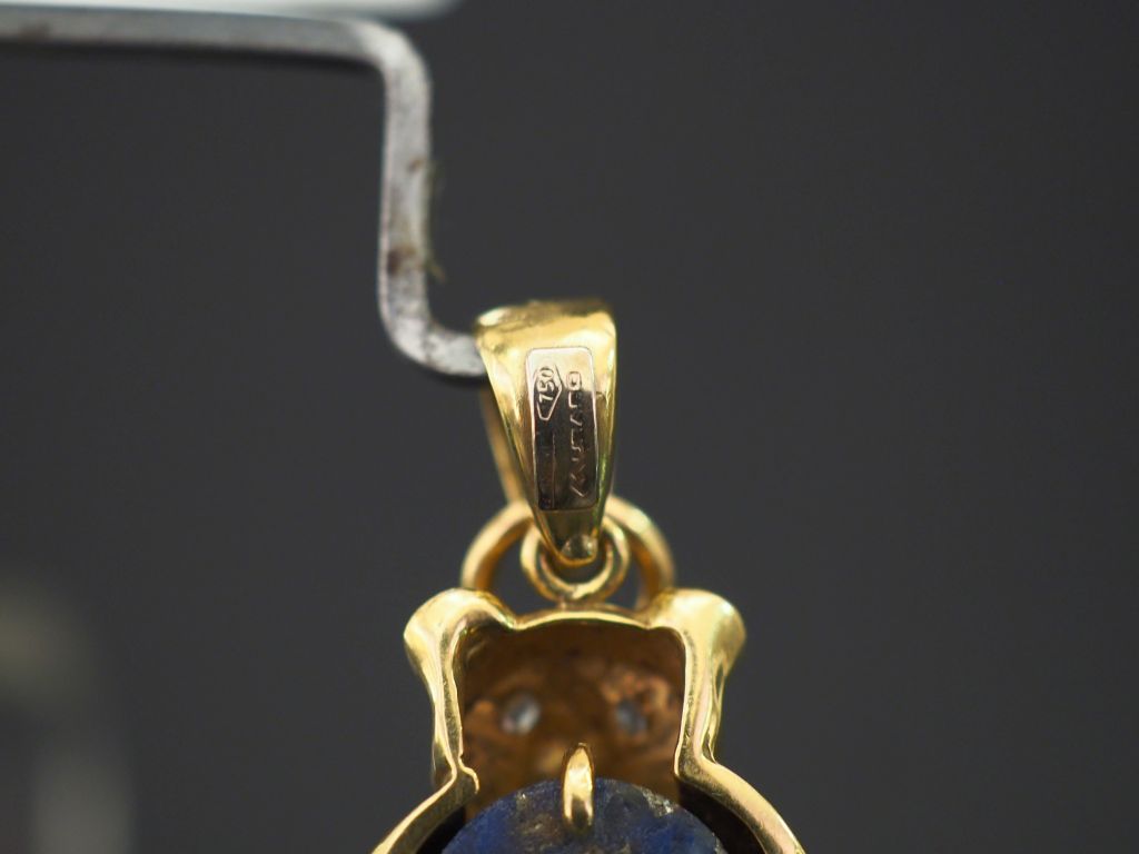 Pendentif en or jaune en forme d'ourson, serti d'un cabochon de lapis lazuli pour la panse et de pierres à l'imitation du diamant pour les yeux. H. 2,5 cm (sans la bélière) Signé. Poids tel. 7,68 g