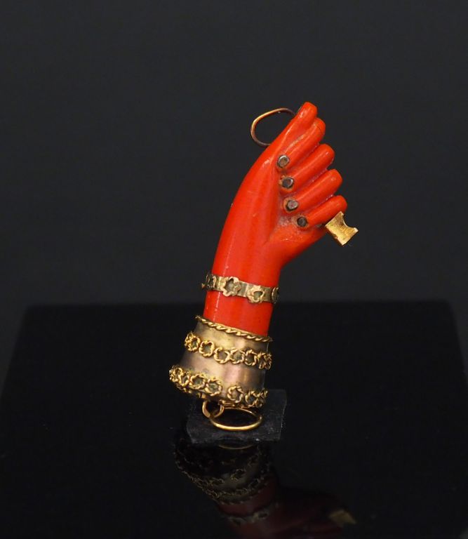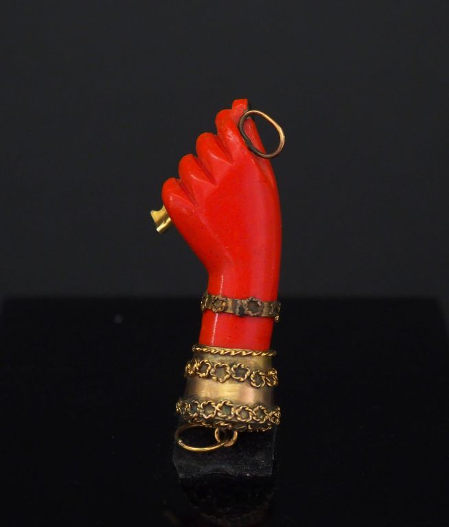 Pendentif en or jaune et composition imitant le corail, figurant une main tenant une clé. H. 4 cm Poids tel. 5 g