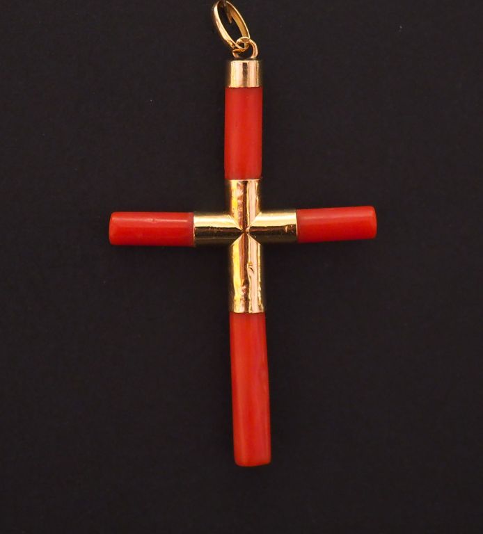 Pendentif en or jaune et corail en forme de croix. 5 x 3,3 cm Poids tel. 3,29 g (branche légèrement tordue)