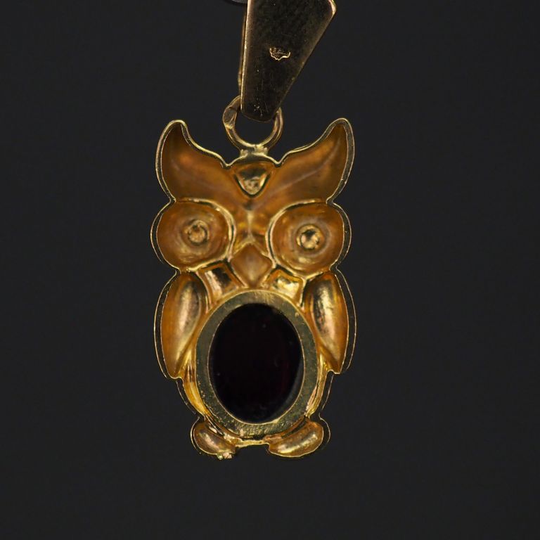 Pendentif en or jaune et pierre dure en cabochon, en forme de chouette. H. 2,5 cm Poids tel. 4,62 g