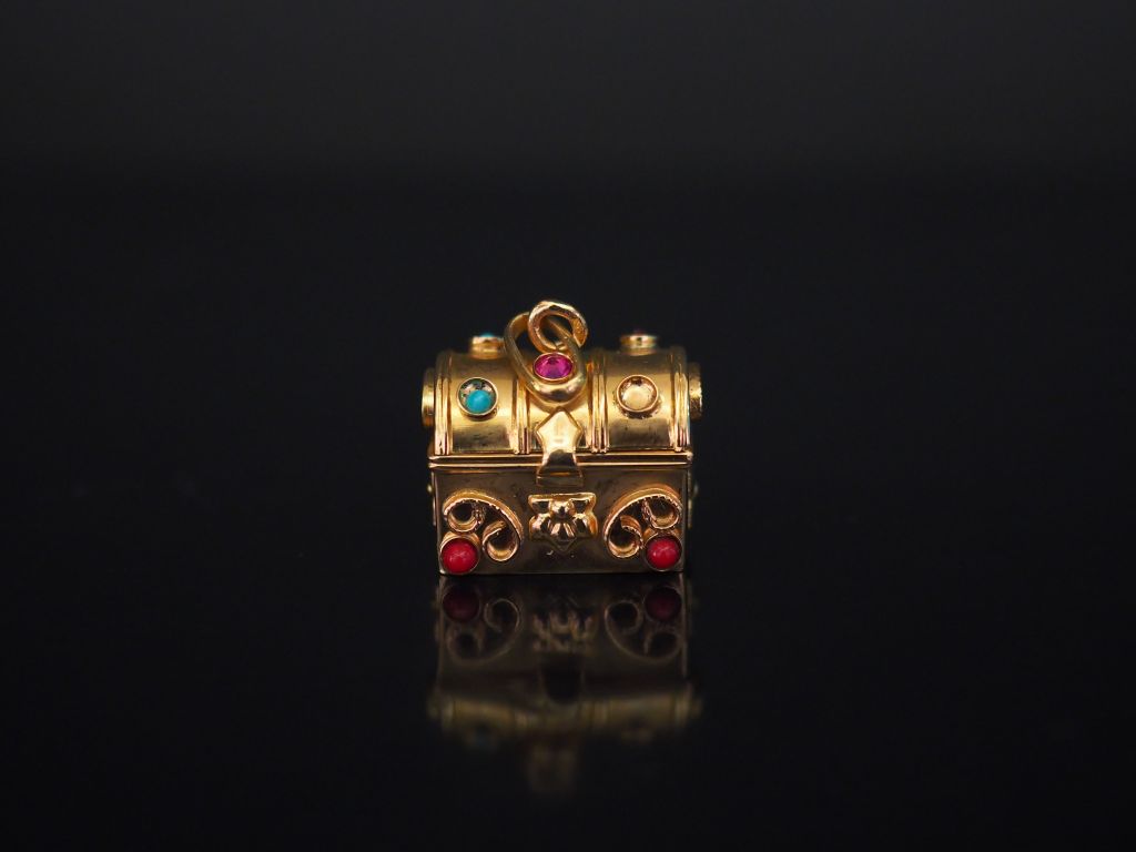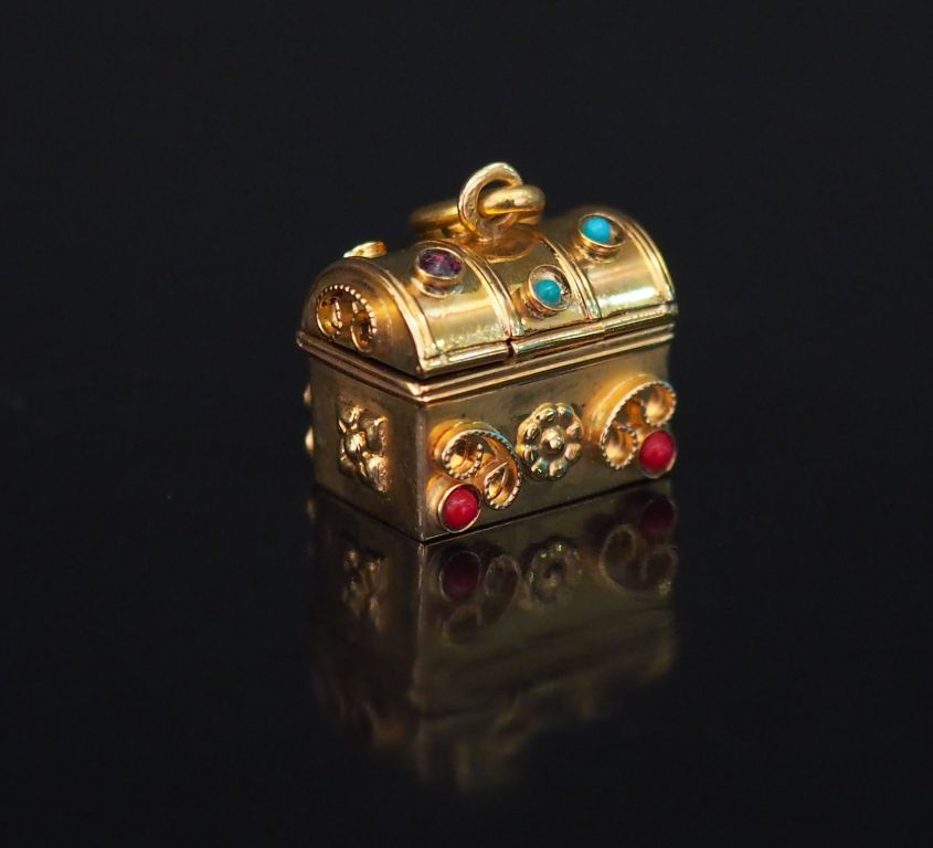 Pendentif en or jaune et pierres de couleur en cabohcon en forme de coffre. 1,3 x 1,6 x 1,1 cm Poids tel. 4,28 g