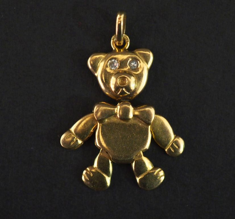 Pendentif en or jaune, figurant un ourson articulé au nœud papillon. Les yeux sertis de deux petits diamants. 2,9 x 2 cm Poids tel. 8,67 g
