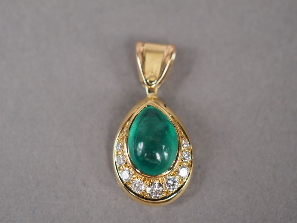 Pendentif en or jaune, orné d'une émeraude en cabochon et de neuf petits diamants. Poids tel. 2,55 g