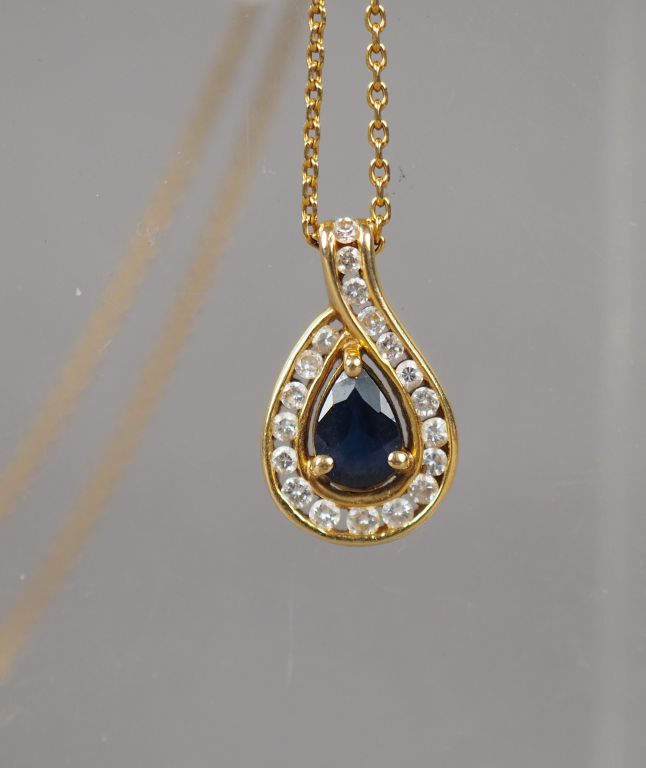 Pendentif en or jaune, saphir et diamants et sa chaine en or jaune. Poids tel.3,72 g