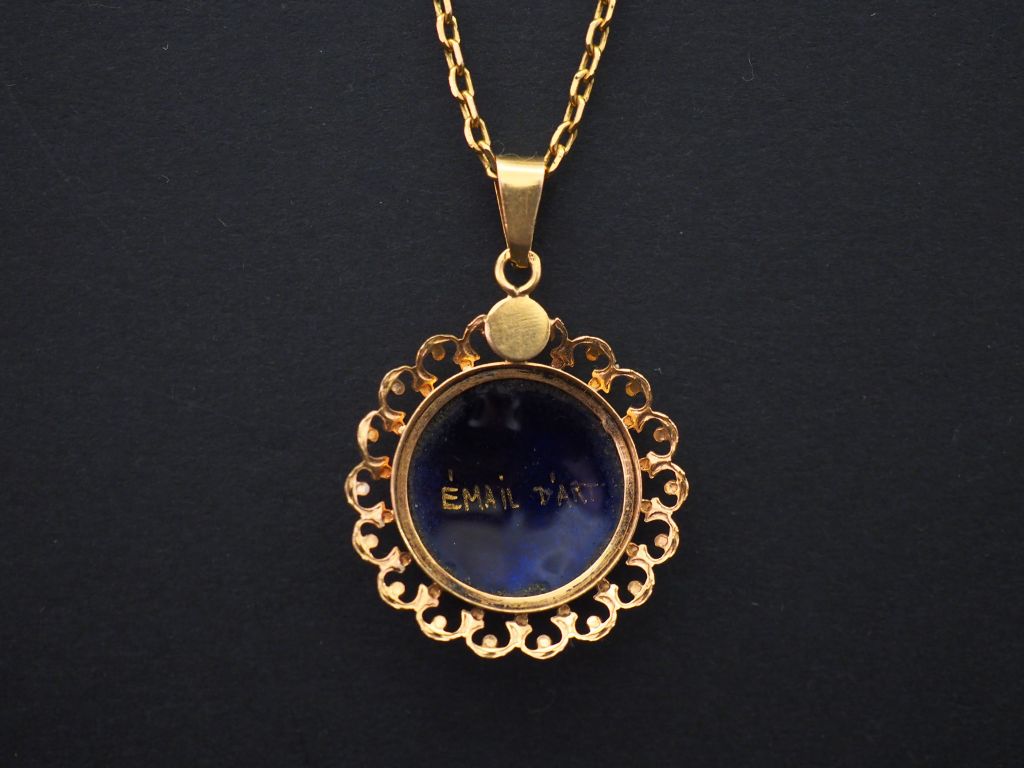 Pendentif en or jaune, serti en son centre d’un émail, à décor polychrome de jeune femme. Jolie monture ajourée. Diam. 2 cm Poids tel. 2,16 g On y joint une chaine en plaqué or.