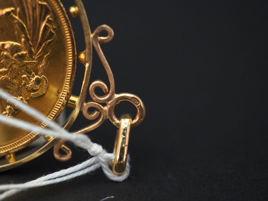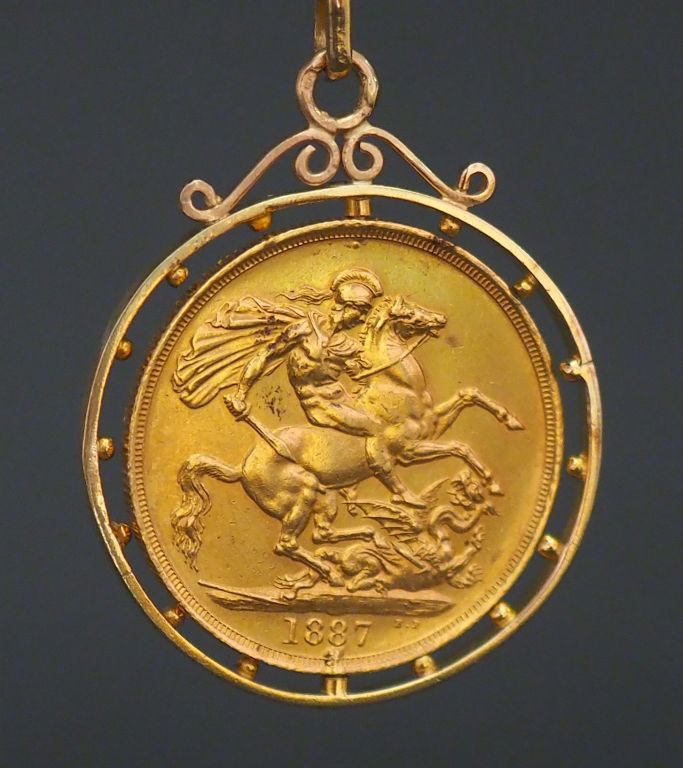 Pendentif en or jaune, serti en son centre d'une pièce d'une pièce or Reine Victoria, 1887. Diam. 3,4 cm Poids. 20,36 g