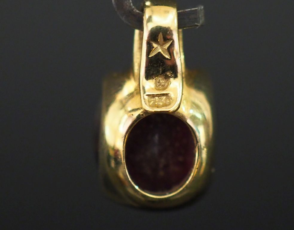 Pendentif en or jaune, serti en son centre d'une pierre rouge. H. 1,8 ...