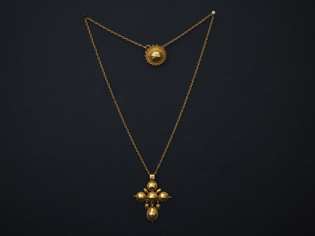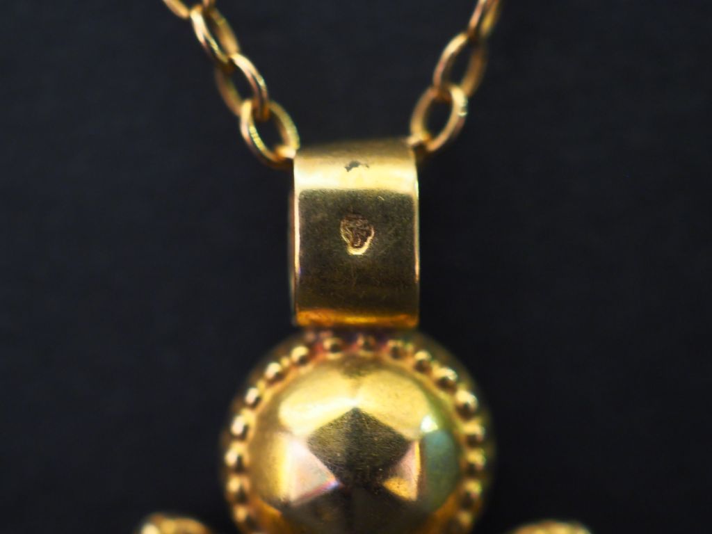Pendentif et sa chaine en or jaune, maille forçat. Le pendentif en forme de croix, à décor de demi sphères facettées. On y joint un pendentif en or jaune, en forme de fleur. Long. 40 cm Poids. 6,88 g (petits enfoncements)