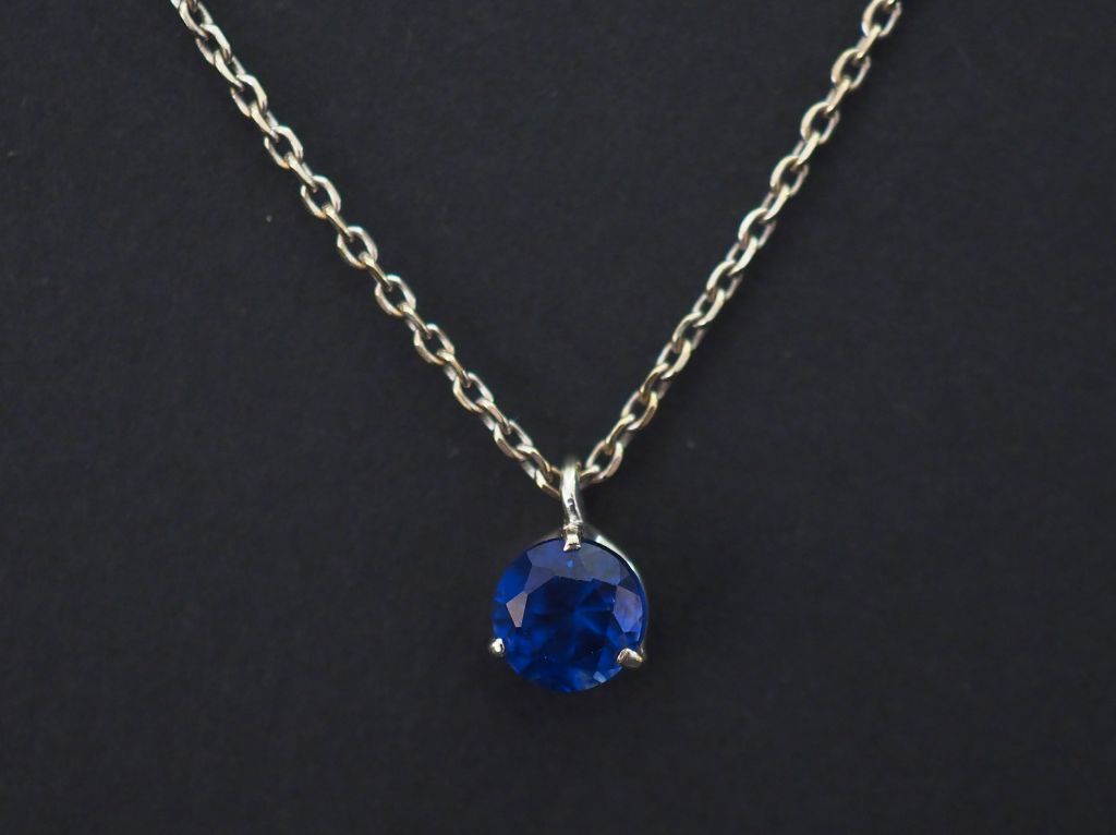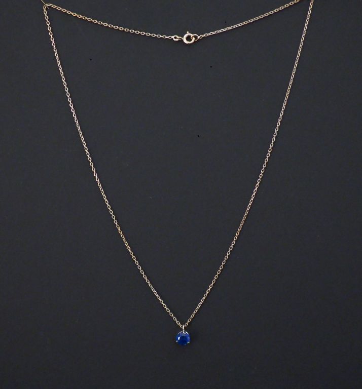 Pendentif et sa chaine, maille forçat en or blanc, serti en son centre d'un petit saphir. Diam. 0,5 cm (environ) Long. de la chaine : 40 cm Poids tel. 2,65 g