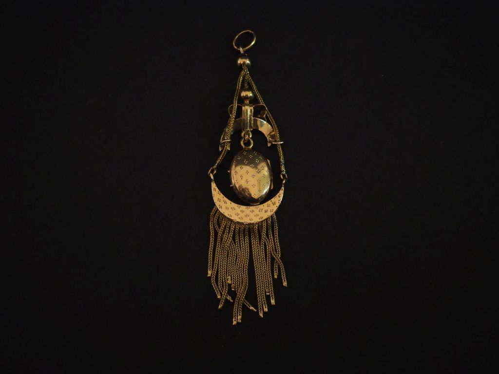 Pendentif Napoléon III de style Louis XVI en or jaune 750, à décor d'un porte-photo en pendeloque retenu par un nœud de ruban et agrémenté en partie inférieure de franges. 9 x 2,4 cm Poids tel. 11,45 g
