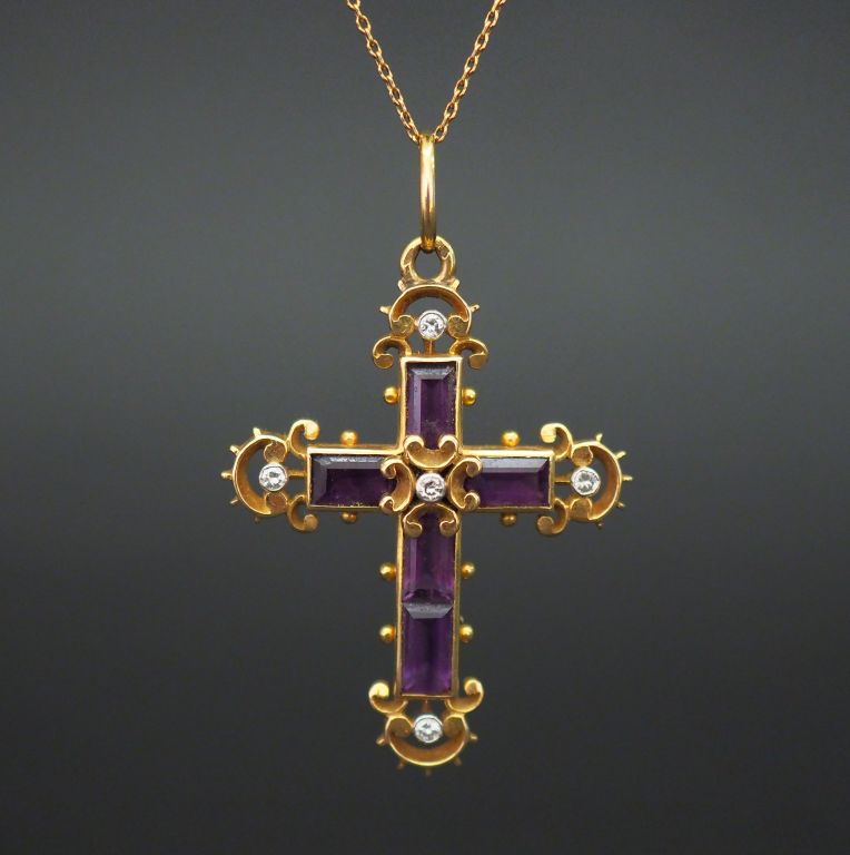 Pendentif Napoléon III en or jaune en forme de croix, serti d’améthystes calibrées et de petits diamants au centre et sur les extrémités. 4 x 3,3 cm On y joint une chaine en or jaune. Long. 40 cm Poids tel. 11,77 g