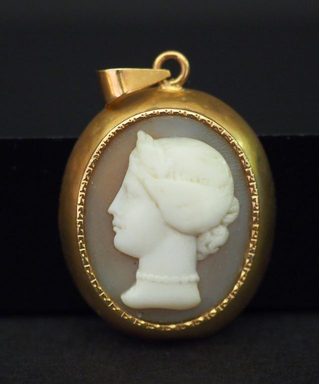 Pendentif Napoléon III en or jaune, serti en son centre d’un camée figurant une jeune femme au collier de perles. 2,7 x 2,3 cm Poids tel. 3,80 g