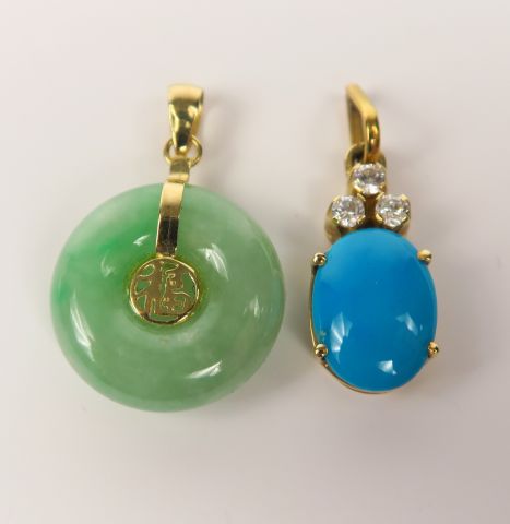 Pendentif orné d'une turquoise et de trois petits brillants, monture en or. Poids tel : 2,4 g, et on y joint un pendentif en jade, monture en or
