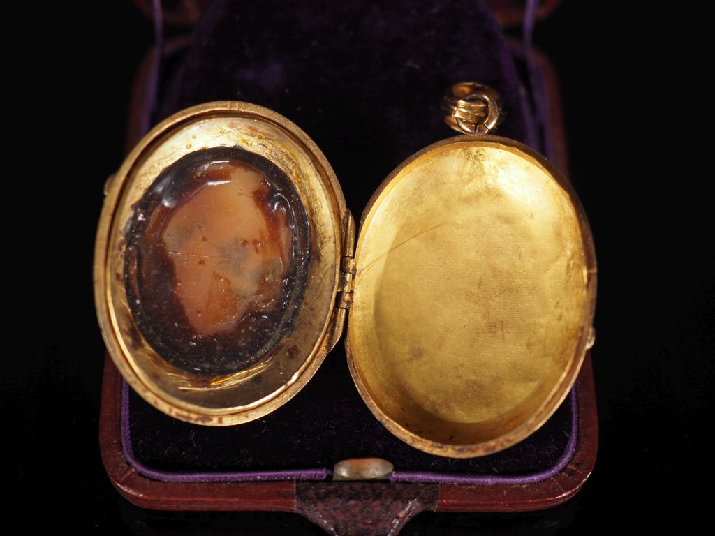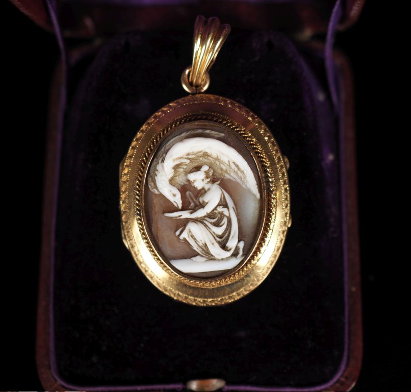 Pendentif porte-photo en or jaune 750 de forme ovale, serti en son centre d'un camée figurant une scène mythologique. Jolie bélière cannelée. Avec son verre à l'intérieur. 3,3 x 2,6 cm Poids tel. 12,03 g (colle à l'intérieur)