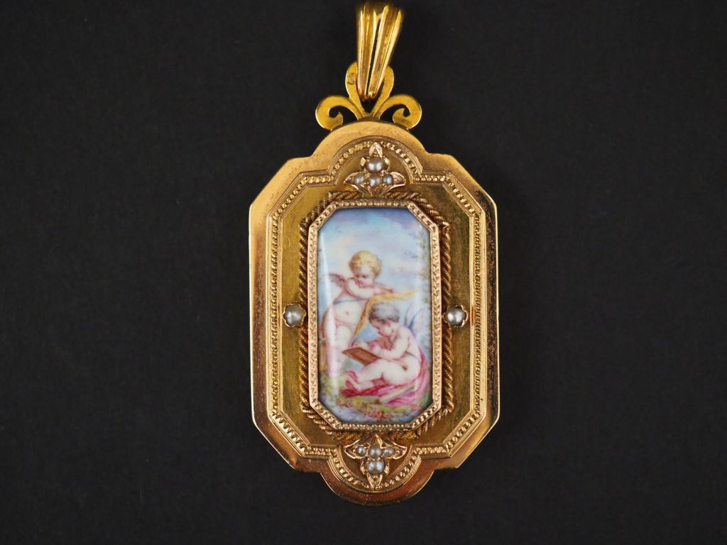 Pendentif porte-photo Napoléon III de style Louis XVI en or jaune et perles, ornée en son centre d'une plaque à décor d'amours. Dim. sans la bélière : 5,2 x 3 cm Poids tel. 24,86 g