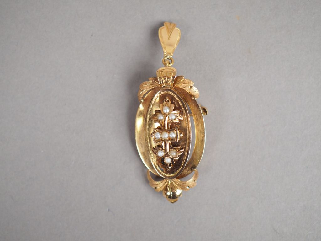 Pendentif transformable en broche Napoléon III en or jaune et perles, à décor de branchages. 5,2 x 2 cm Poids tel. 3,52 g (petits enfoncement)