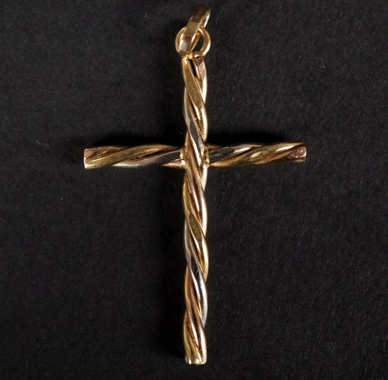 Pendentif trois tons d'or 750, en forme de croix, à décor torsadé. 3,2 x 2,2 cm Poids. 1,82 g