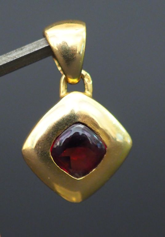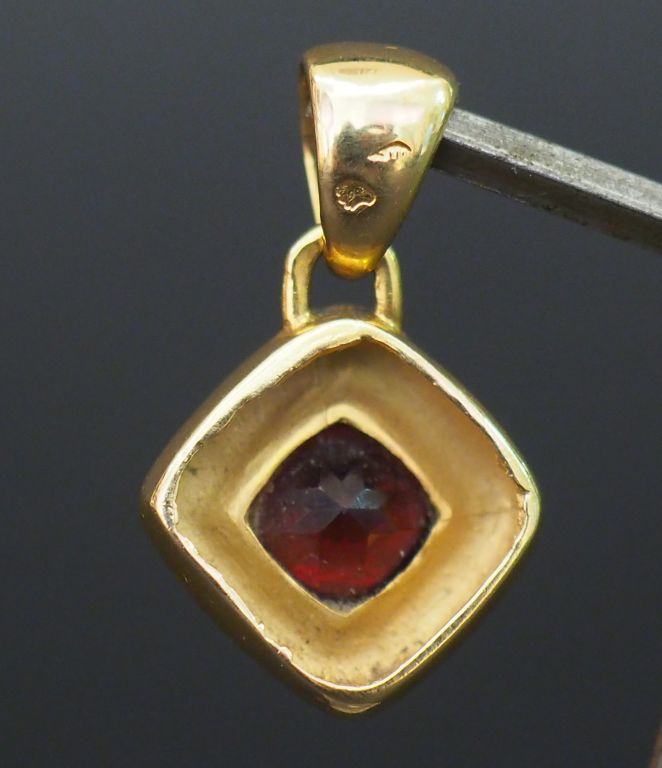 Petit pendentif en or en forme de losange orné d'une pierre rouge. Poids : 3,90 g