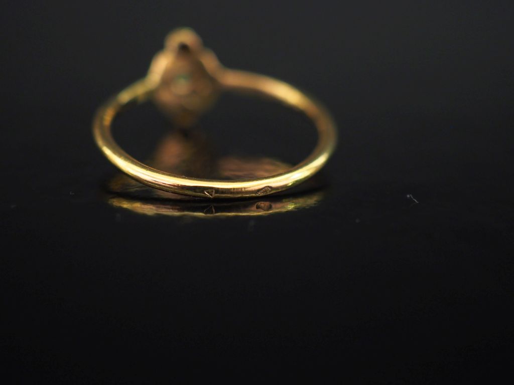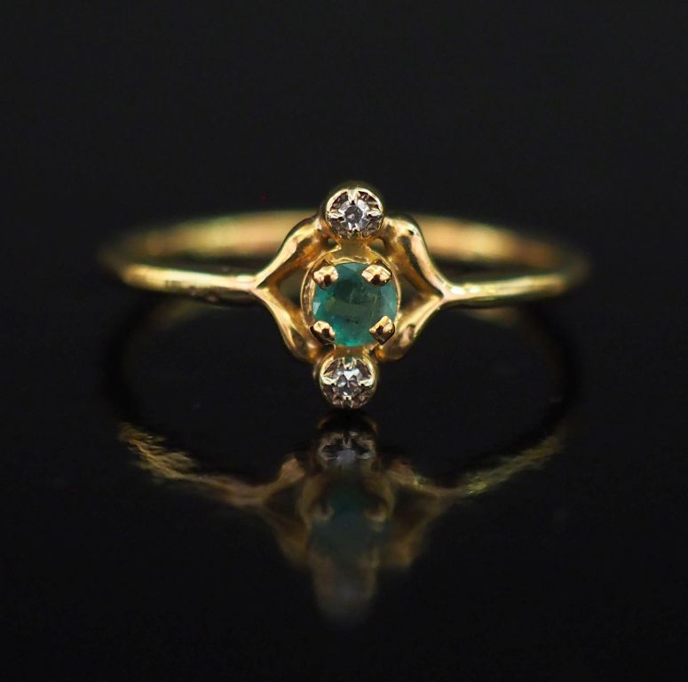 Petite bague ajourée en or jaune 750, sertie en son centre d'une émeraude épaulée de deux petits diamants. TDD. 53 1/2 Poids tel. 1,55 g