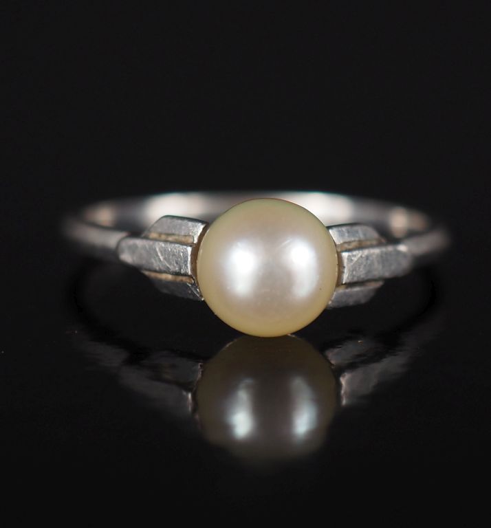 Petite bague de style Art déco en platine 850, sertie d'une demi-perle blanche. TDD. 49 Poids tel. 2,14 g