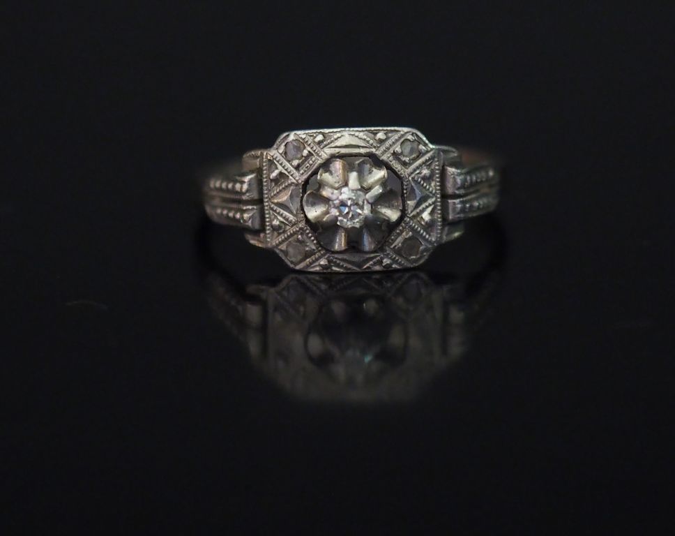Petite bague de style Art déco en platine et or blanc, sertie en son centre d’un petit diamant et de quatre petits éclats de diamants. TDD. 51 Poids tel. 1,94 g