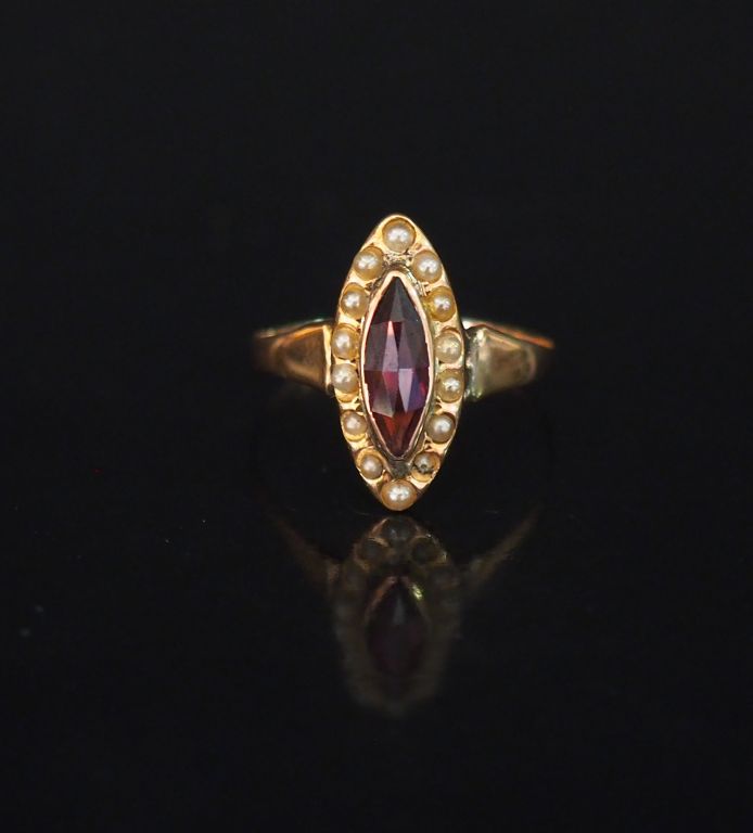 Petite bague Napoléon III de forme marquise en or jaune, sertie d'une pierre mauve entourée de petites perles blanches. TDD. 53 Poids tel. 1,59 g