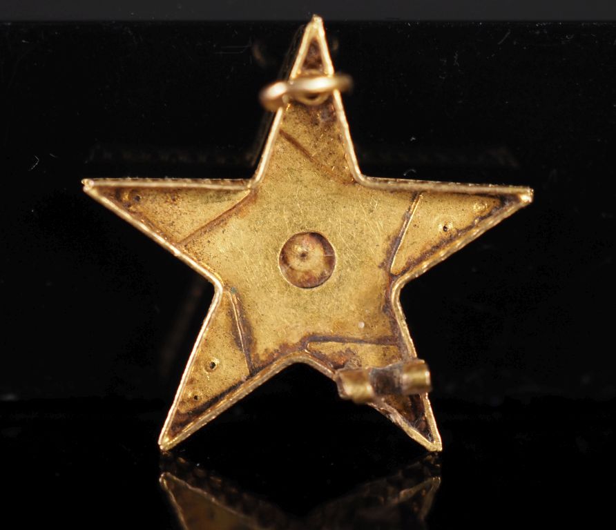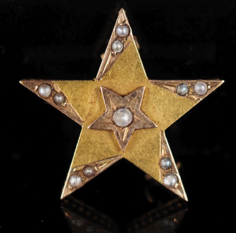 Petite broche en forme d'étoile en or jaune 750, sertie de demi perles. 2,2 x 2,2 cm Poids tel. 1,38 g (manque la pique)